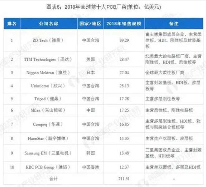 全球印刷電路板行業(yè)集中度不高,生產(chǎn)商眾多,市場(chǎng)競(jìng)爭(zhēng)充分。雖然目前PCB行業(yè)存在向優(yōu)勢(shì)企業(yè)集中的發(fā)展趨勢(shì),但在未來(lái)較長(zhǎng)時(shí)期內(nèi)仍將保持較為分散的行業(yè)競(jìng)爭(zhēng)格局。根據(jù)N.T.Information發(fā)布的2018年世界百?gòu)?qiáng)PCB企業(yè)排行榜,2018年前十大PCB廠商收入合計(jì)為211.51億美元。2018年全球前十大PCB廠商的銷售情況如下: