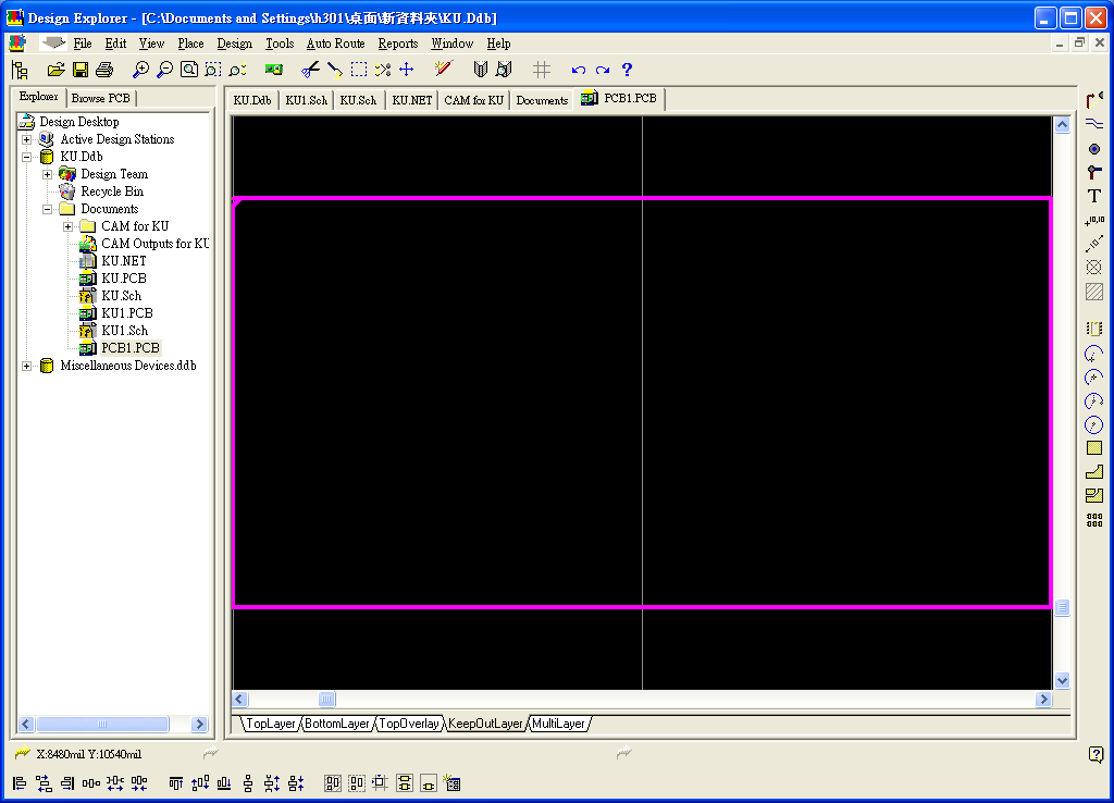 雙擊新命名之PCB檔,進入PCB布線畫面,先點選畫面下方之KeepOutLayer頁面標(biāo)籤,再用畫面右側(cè)之繪圖線畫出邊框線,如圖14。畫面一樣用PageUp或PageDown調(diào)整至適合大小做繪圖。