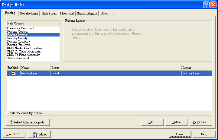因列舉電路不是很複雜關(guān)系,所以我們用單面版就可以布線完成,而通常PROTEL里預(yù)設(shè)版面是以雙面來進行布線,所以我們要選擇成單面布線。選擇上方主目錄中Design→Rules出現(xiàn)對話框后,選到Routing Layers后,進入右下角的設(shè)定Properties,如圖18。